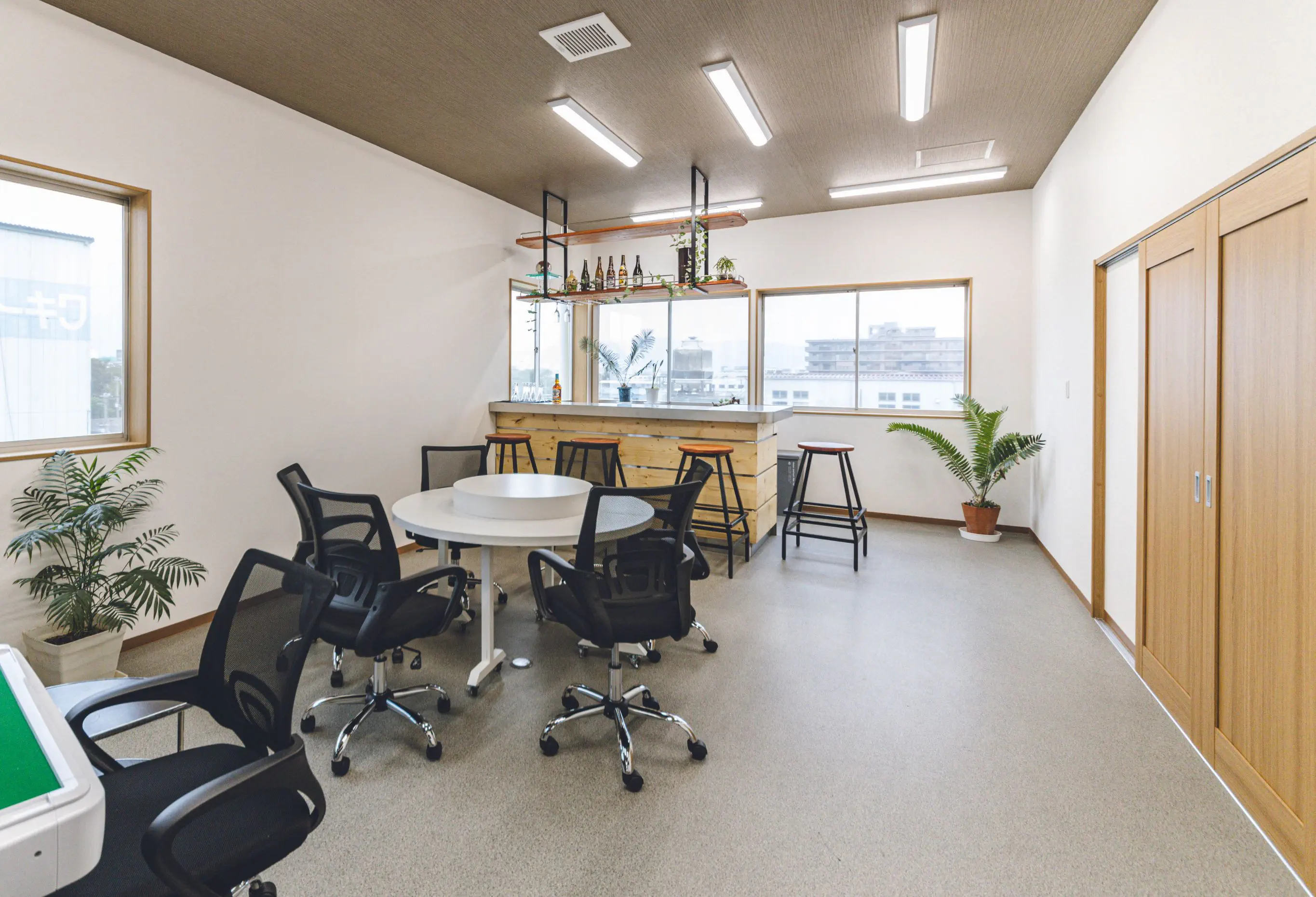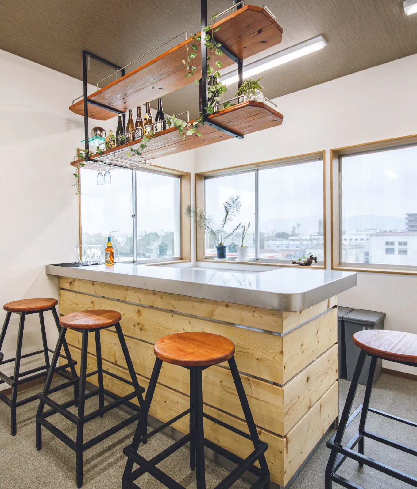 娯楽スペースも全力でつくる。社員が終業後に仕事の疲れを癒せるよう、バーカウンターなどの娯楽スペースを設けています。バーカウンターも椅子も、もちろん当社職人による“常盤クオリティ”です。
